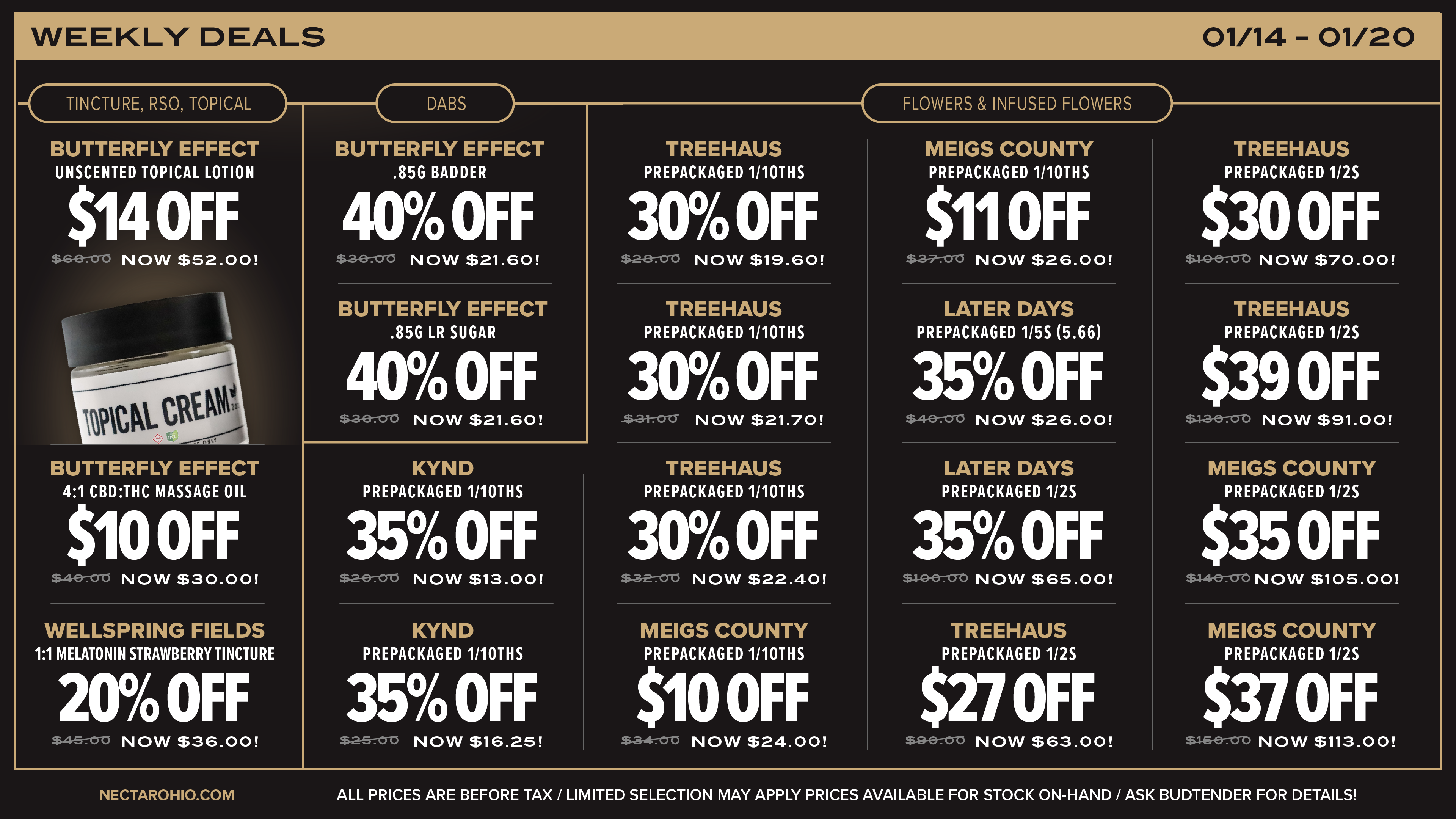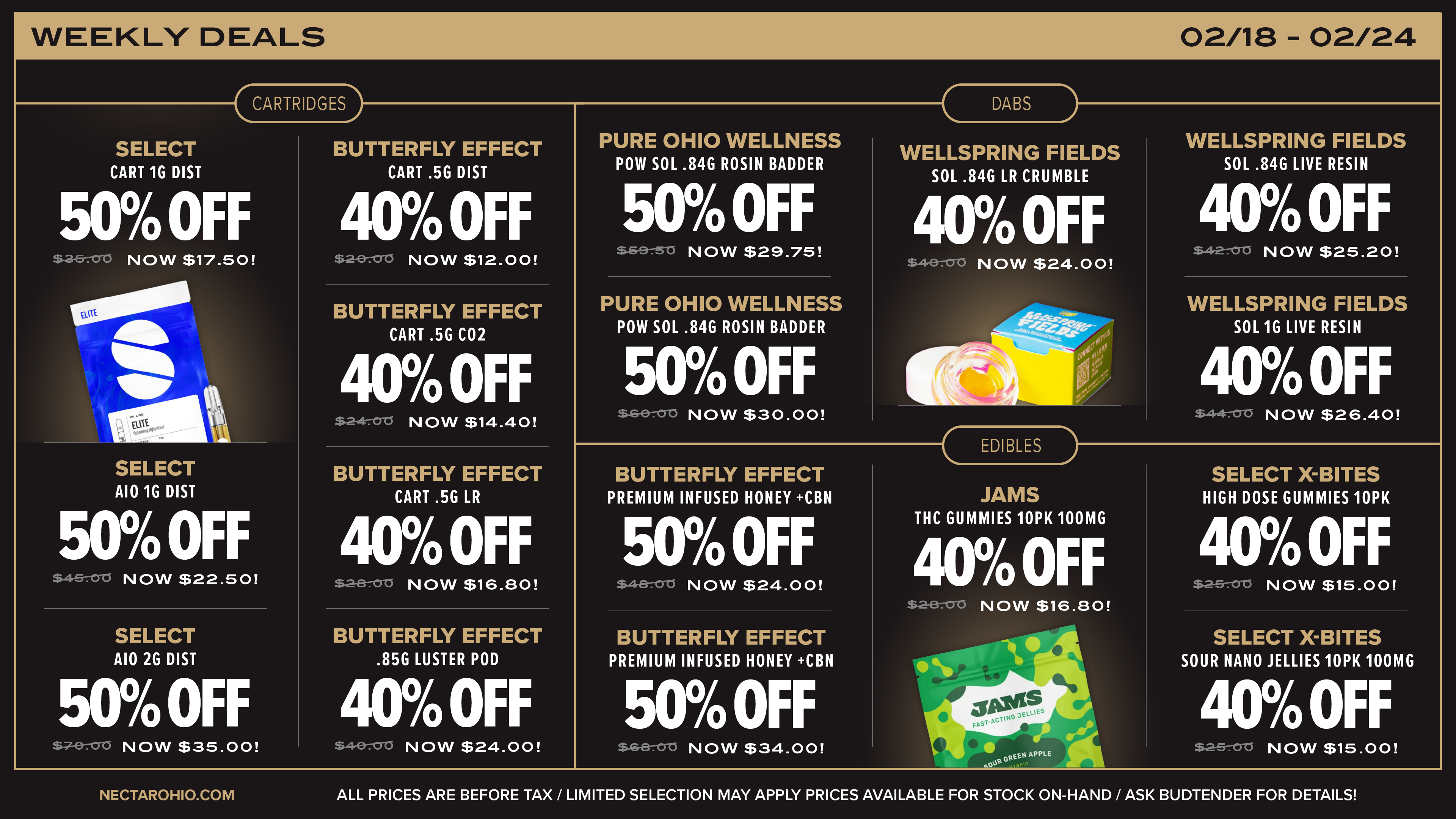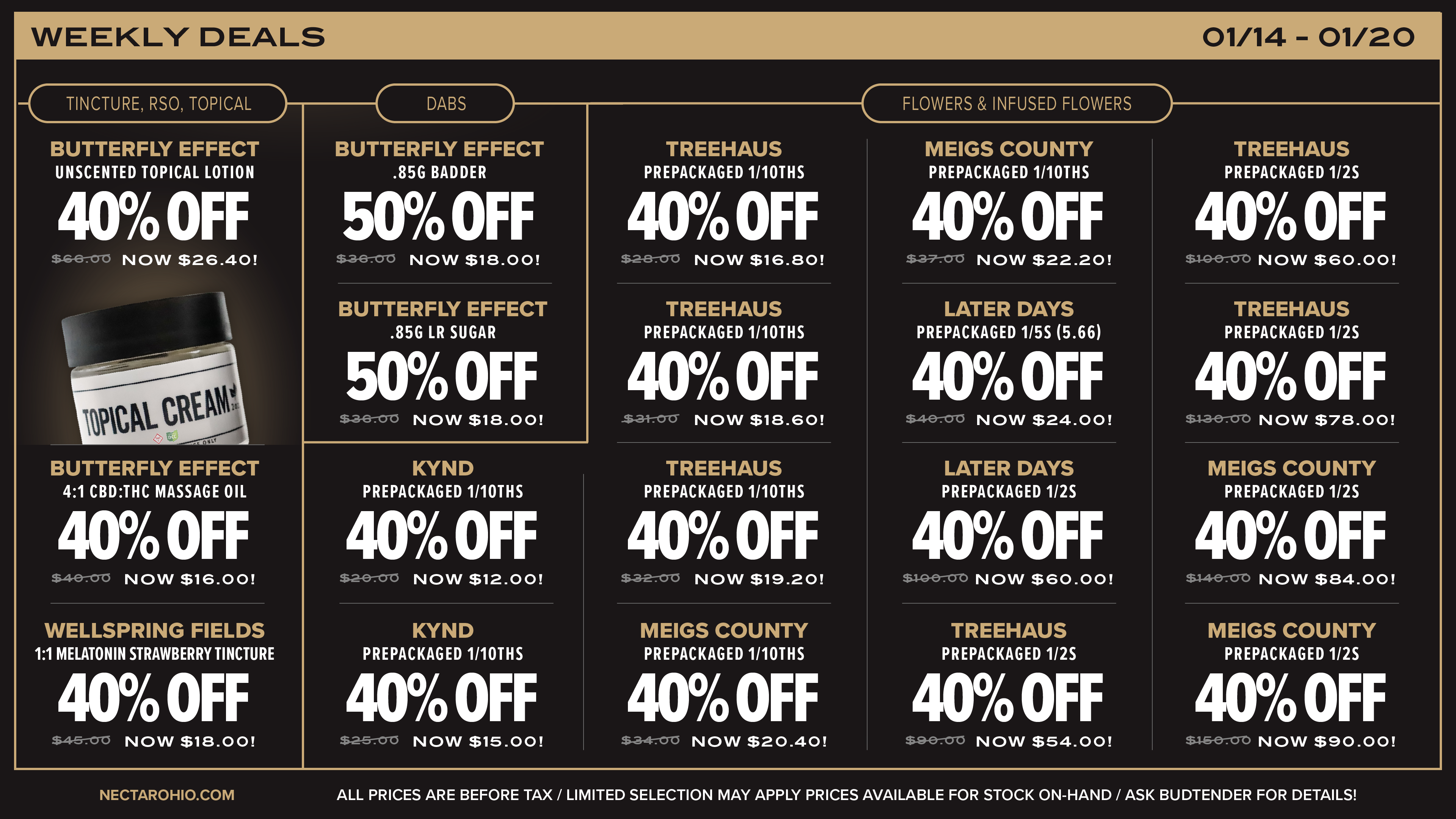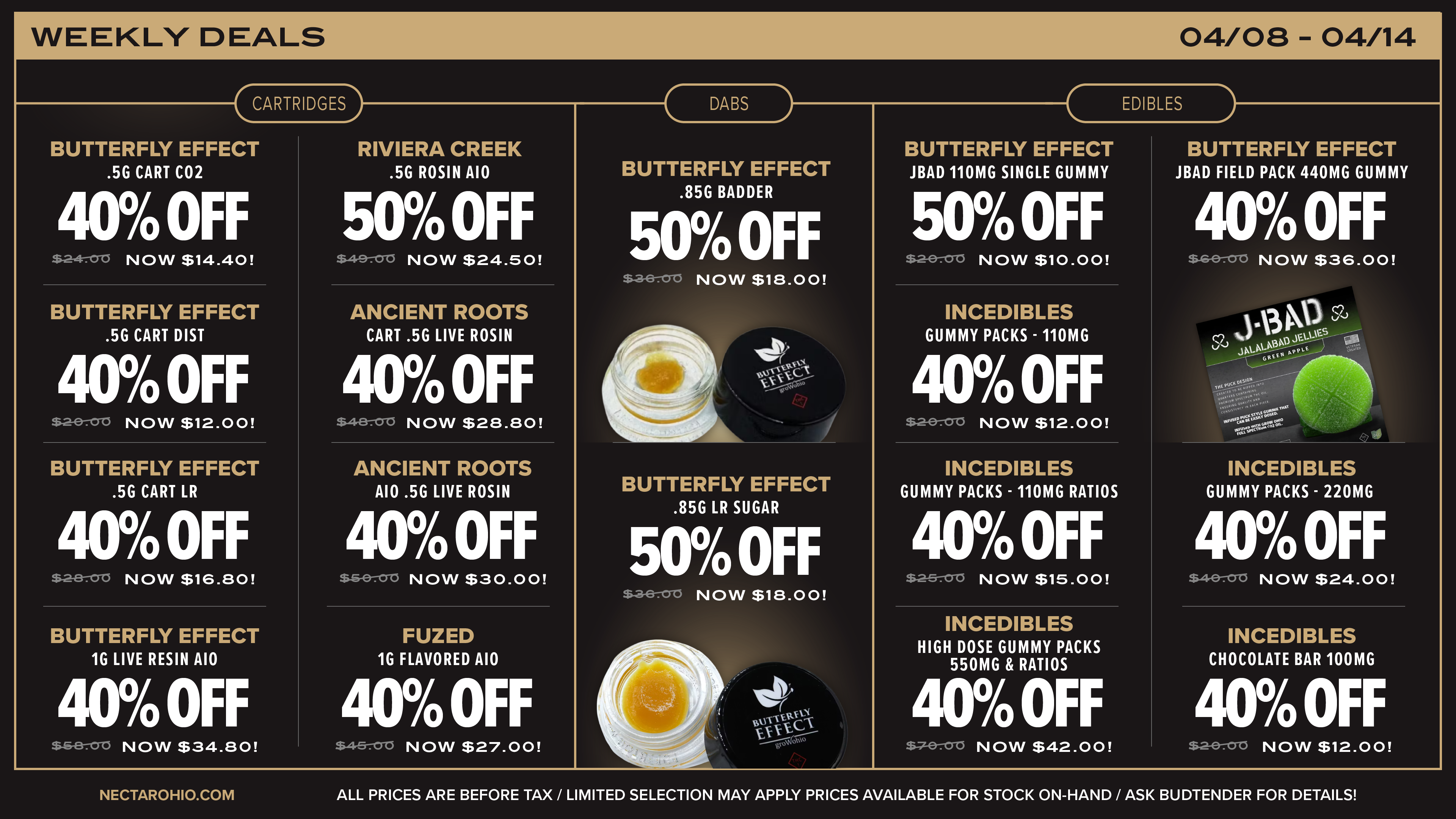 Bowling Green, Harrison, and 5-Mile Rd Cincinnati Dispensary“Check out these deals offered all week long at your local Nectar Medical Cannabis dispensary!” Euclid and Cincinnati Dispensary“Check out these deals offered all week long at your local Nectar Medical Cannabis dispensary!”