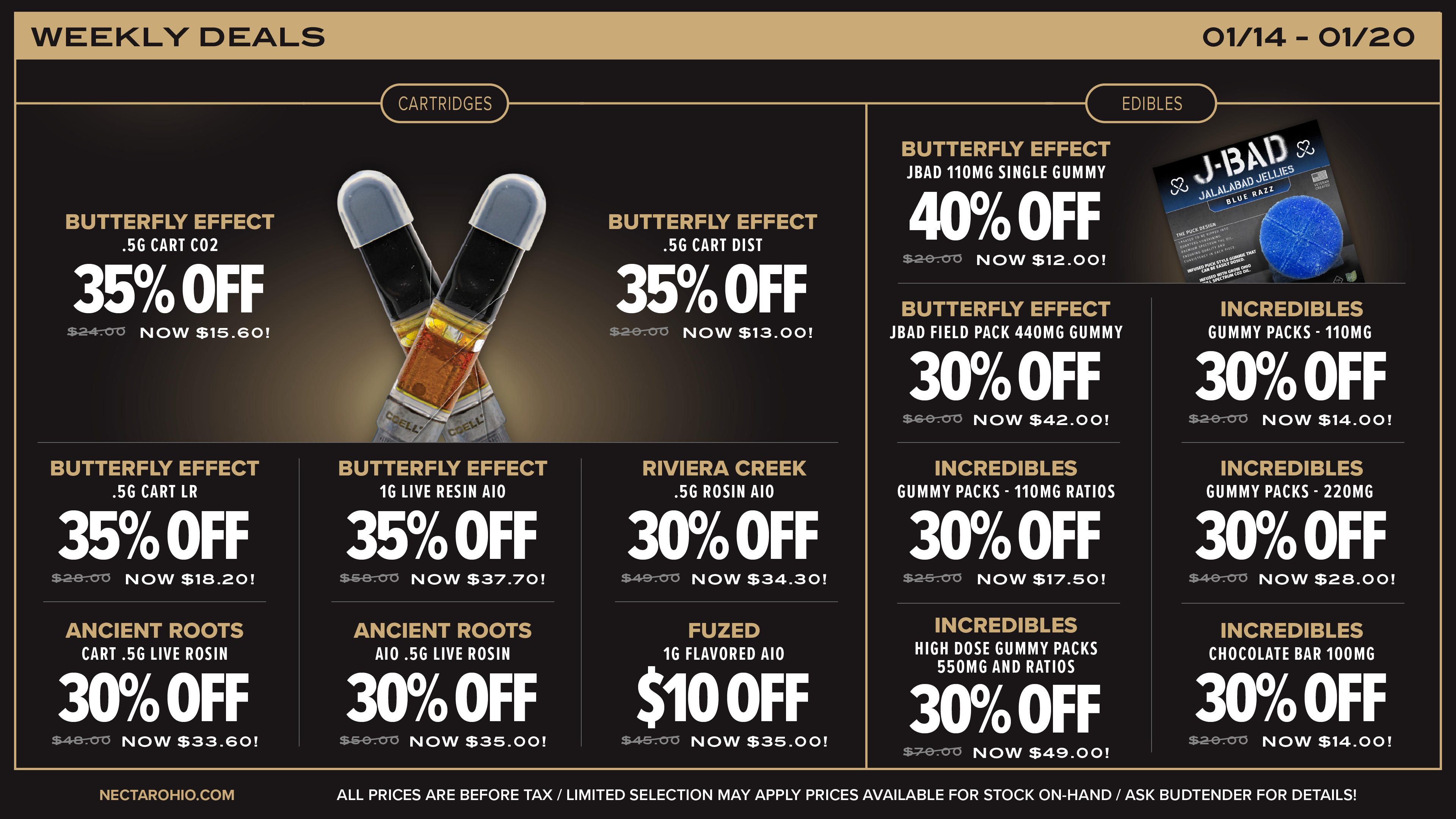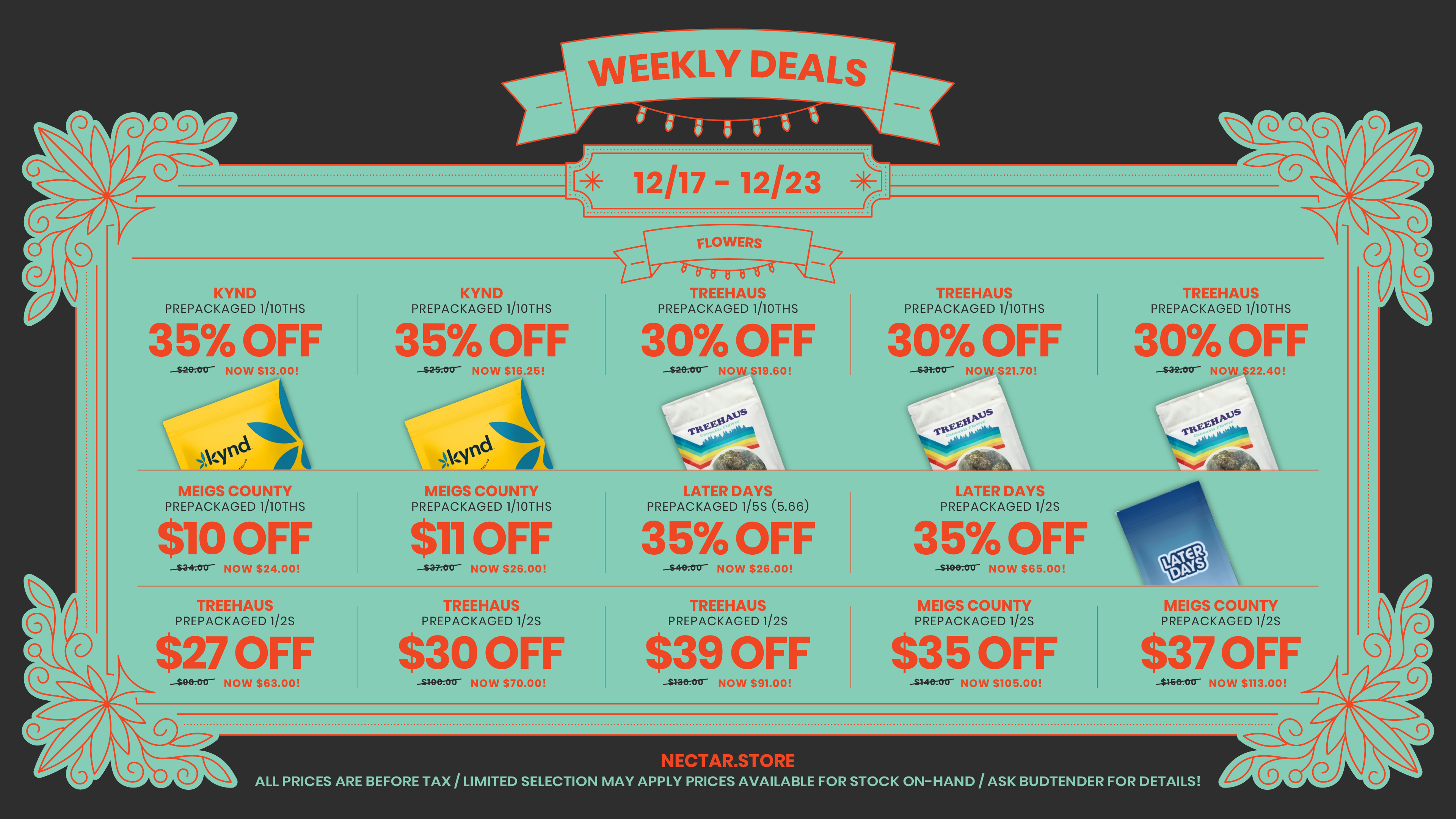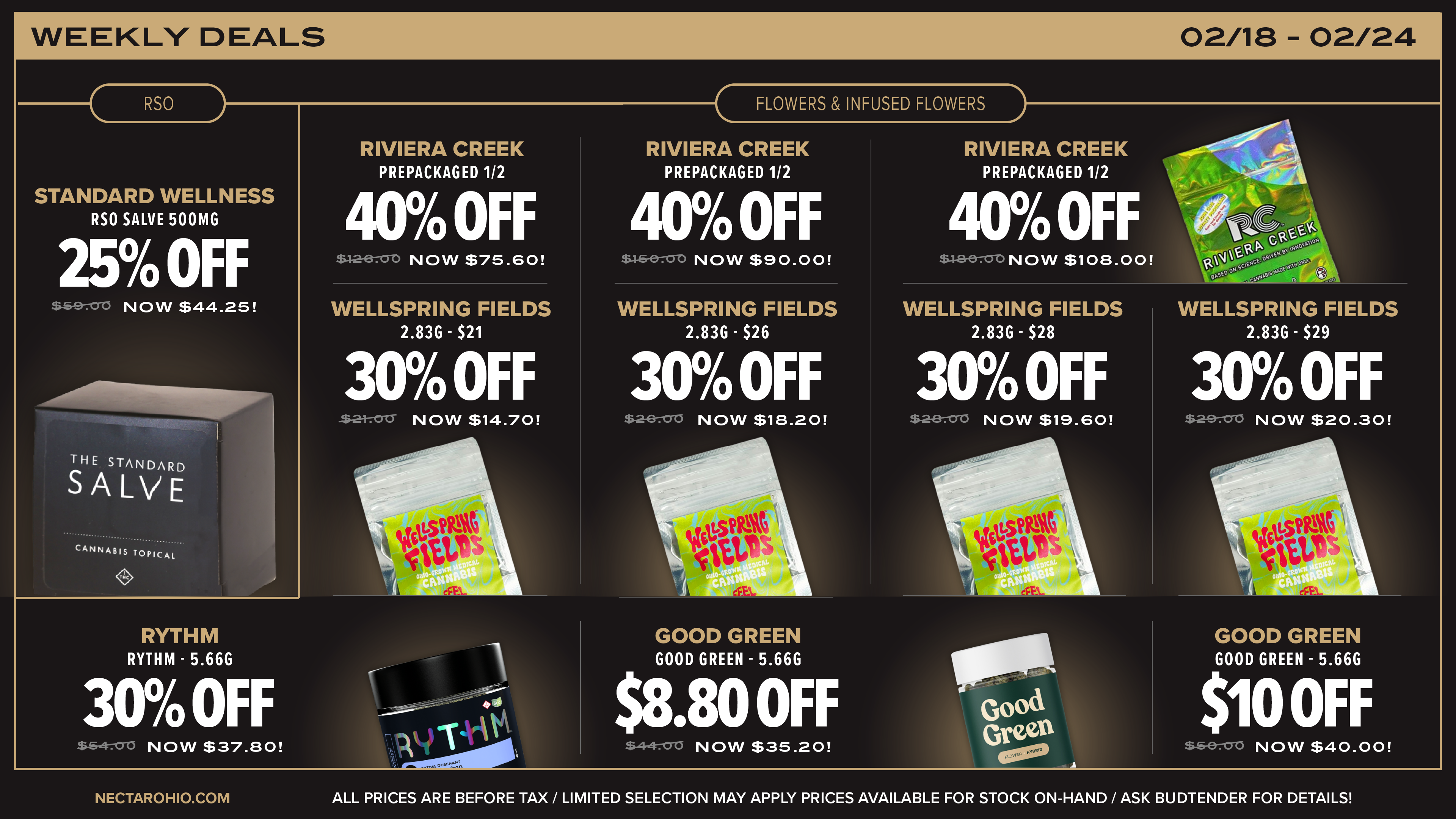 Bowling Green, Harrison, and 5-Mile Rd Cincinnati Dispensary“Check out these deals offered all week long at your local Nectar Medical Cannabis dispensary!” Euclid and Cincinnati Dispensary“Check out these deals offered all week long at your local Nectar Medical Cannabis dispensary!”